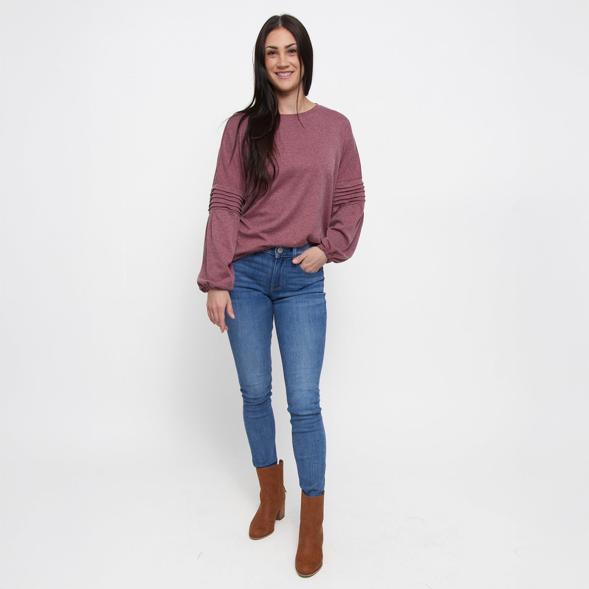 Add a bit of color to your wardrobe with the Carson Pleated Bishop Sleeve Top. Featuring a gorgeous heather tones with fun pleated bishop sleeves and light jersey knit, this top makes for the perfect fall layer.