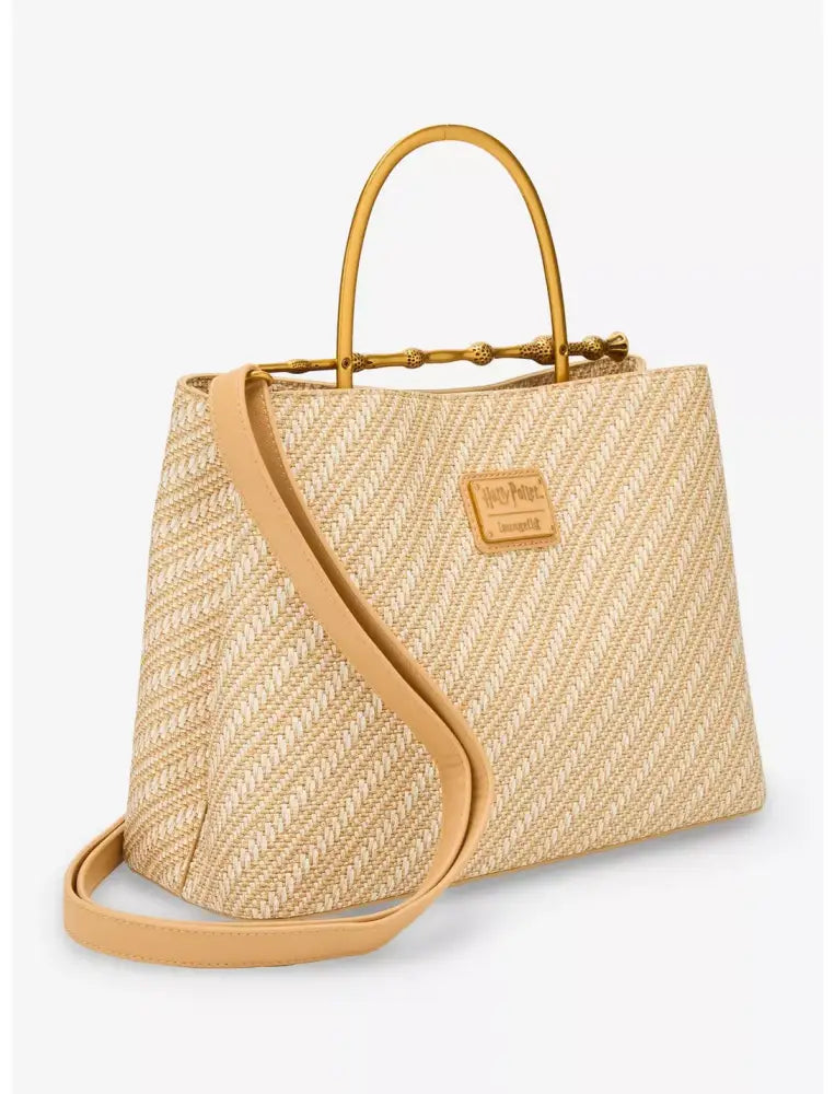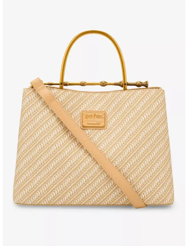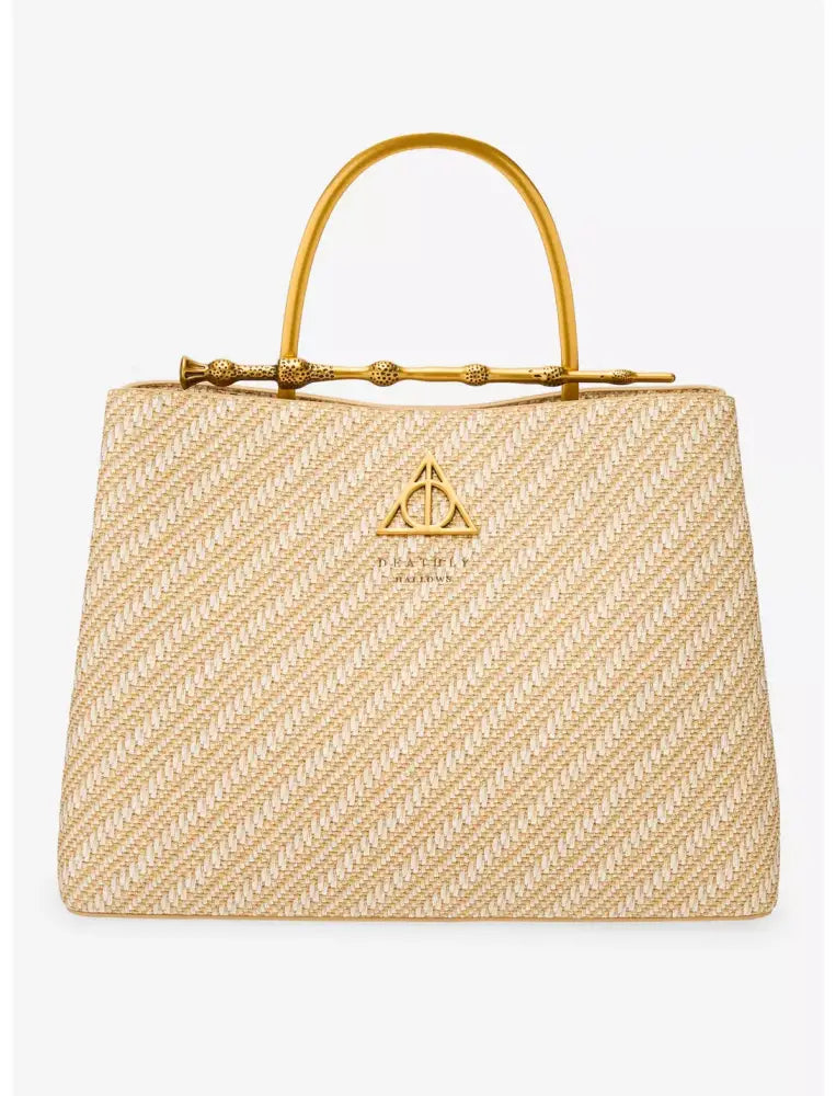 Loungefly Harry Potter Deathly Hallows Elder Wand Raffia Texture Brown Handbag. Add a magical touch to any look with this Harry Potter handbag! Featuring a Deathly Hallows badge on a brown-colored raffia textured body, the top handle includes a metal Elder Wand charm. With a removable crossbody strap and a magnetic closure, this purse is perfect for aspiring witches and wizards.