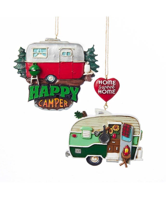 BRING YOUR LOVE FOR THE OUTDOORS TO YOUR HOLIDAY WITH THESE KURT ADLER RESIN PAINTED CAMPER ORNAMENTS.