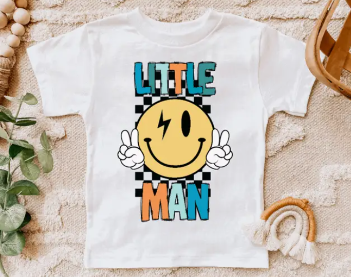 Retro-inspired Little Man boy's tee shirt. Soft comfortable perfect for everyday wear. Stylish design for your little trendsetter. Available in various sizes.