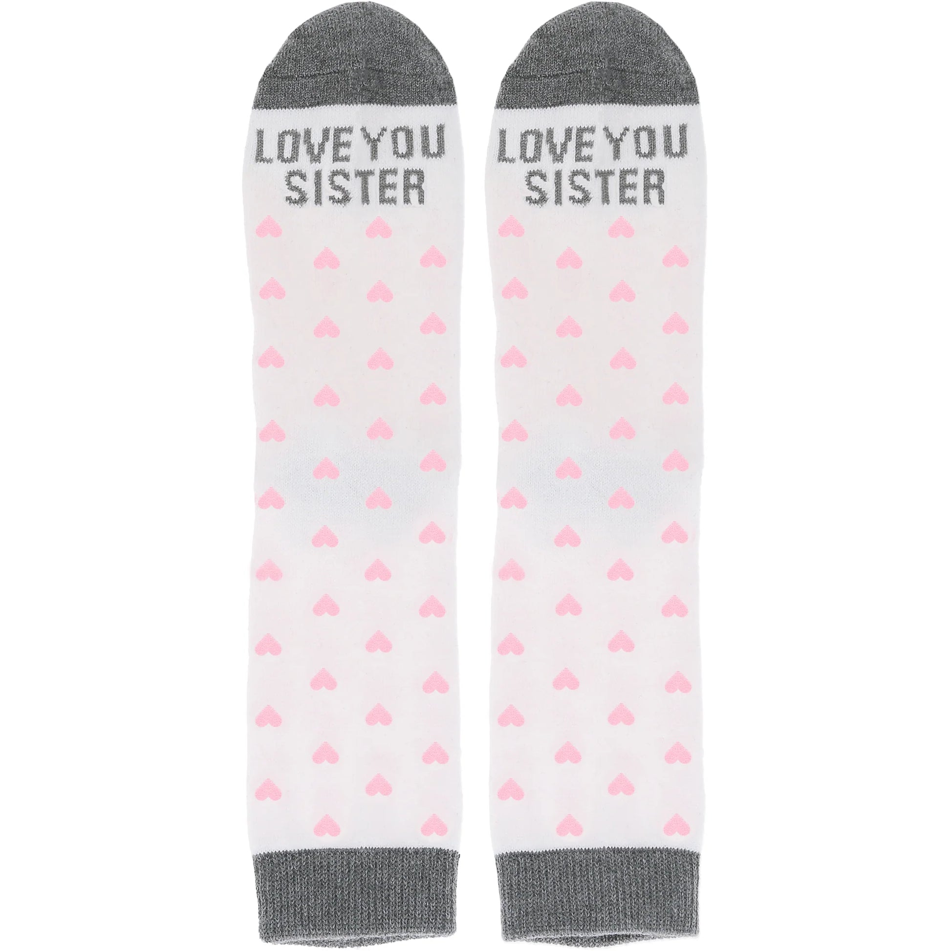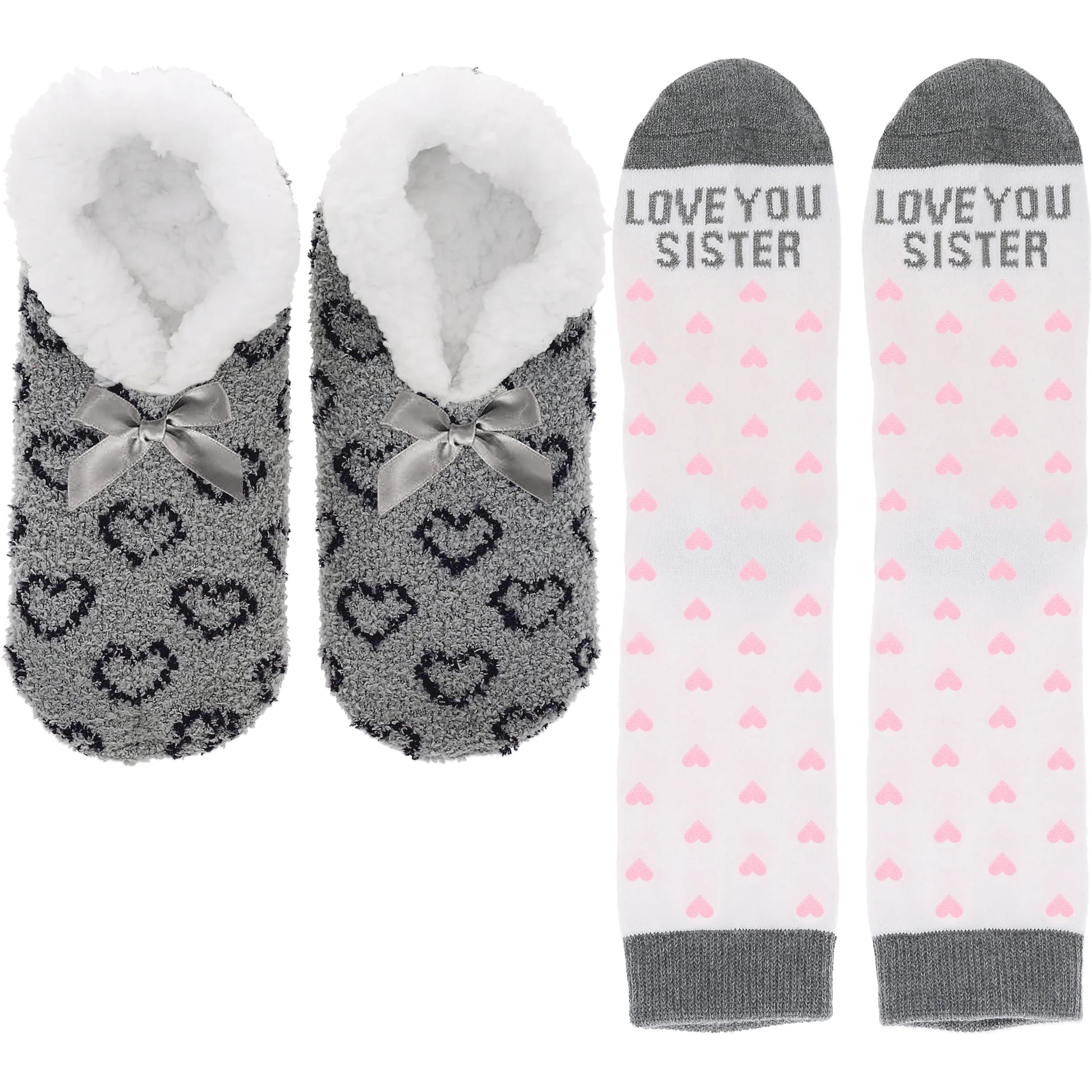 - IN-HOUSE DESIGN: Featuring a cute “Love You Sister” sentiment, this set includes socks with a pink heart design and matching slippers with heart motifs and a ribbon accent. The anti-slip soles of the slippers also display the sweet sentiment, making the set a perfect combination of style and function.