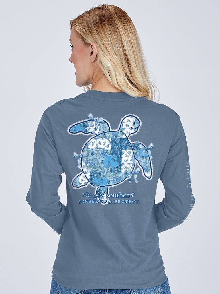 Dive into coastal style with this Simply Southern long sleeve tee, featuring a graceful sea turtle silhouette adorned with delicate blue florals. Crafted from soft 100% cotton, this unisex design offers comfortable everyday wear with signature Simply Southern branding on the chest and sleeve. Perfect for turtle lovers and those who appreciate nature-inspired fashion with a lakeside charm.