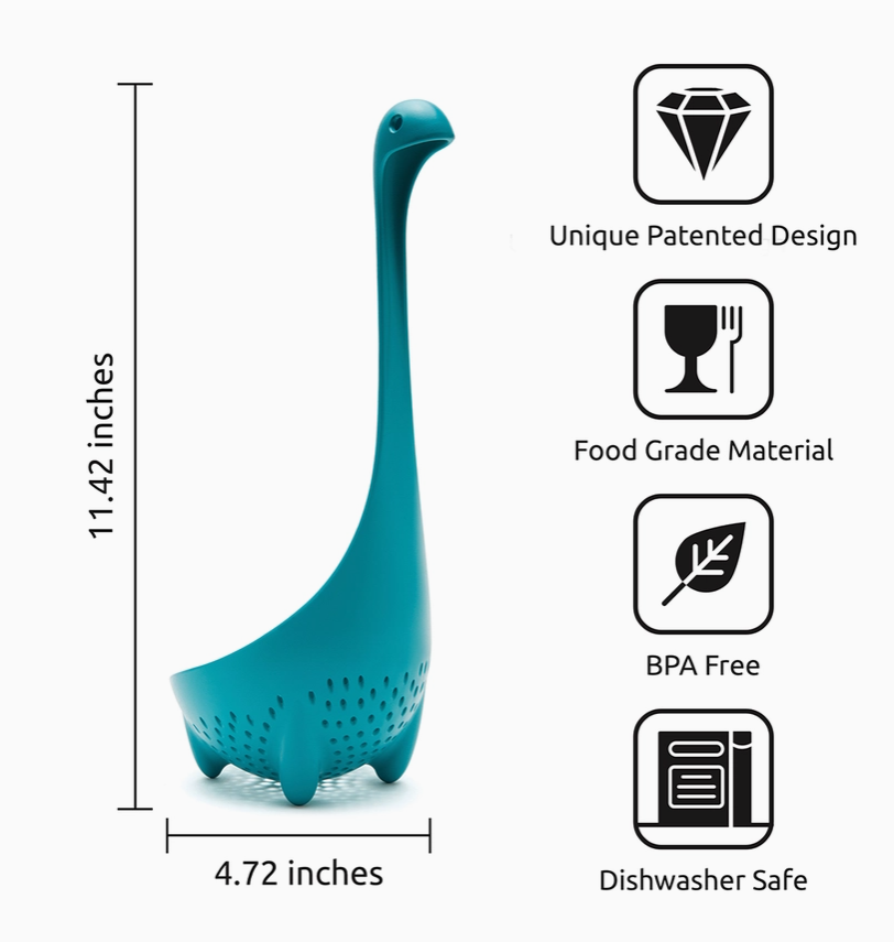 Mamma Nessie Colander Spoon—fun and functional kitchen tool from OTOTO Studio. Heat-resistant dishwasher safe and perfect for serving pasta or veggies. Add mythical charm to your cooking routine!