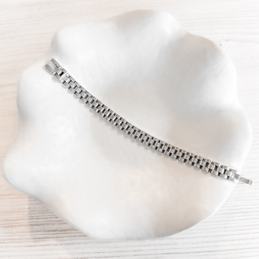 Introducing our Matteo Mixed Metals Watch Band Bracelet! This waterproof accessory adds a stylish touch to any outfit, whether worn alone or layered with another Pretty Simple bracelet you love. Don't miss out on this must-have for any occasion!