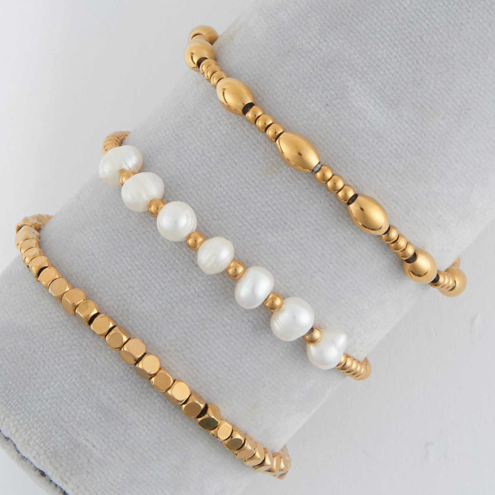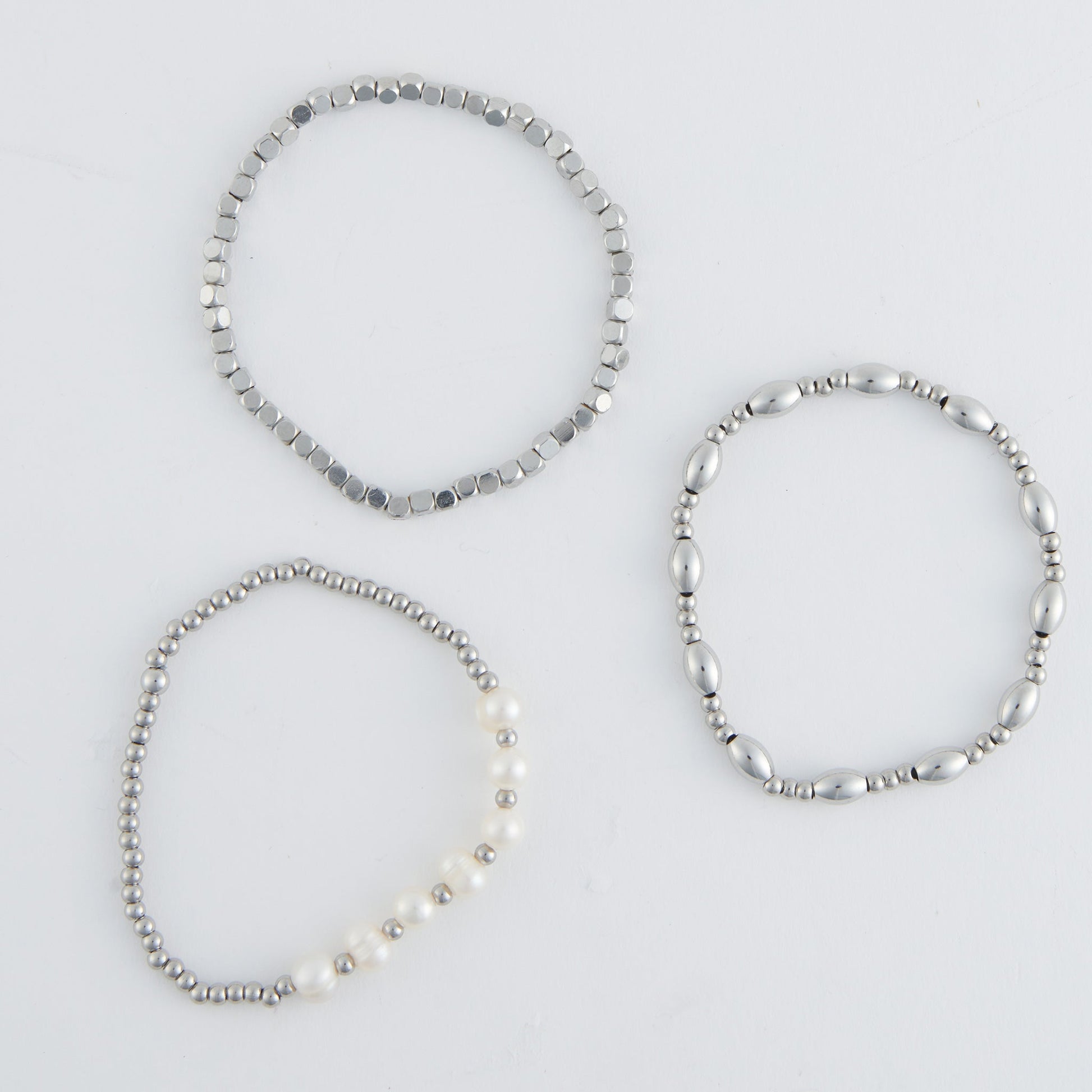 Delicate meets distinctive in the Narelle Genuine Pearl & Ball Bracelet Set—a trio designed for modern elegance. This 3-piece stretch-fit stack features polished ball beads accented with luminous genuine pearls, offering a refined mix of texture and shine. Available in radiant 18K gold or polished stainless steel, each bracelet is coated with our signature waterproof, tarnish-resistant PVD finish. Wear them solo or as a graceful set for timeless charm with everyday durability. Where classic pearls meet modern polish—crafted to wear, layer, and love.