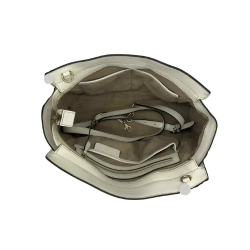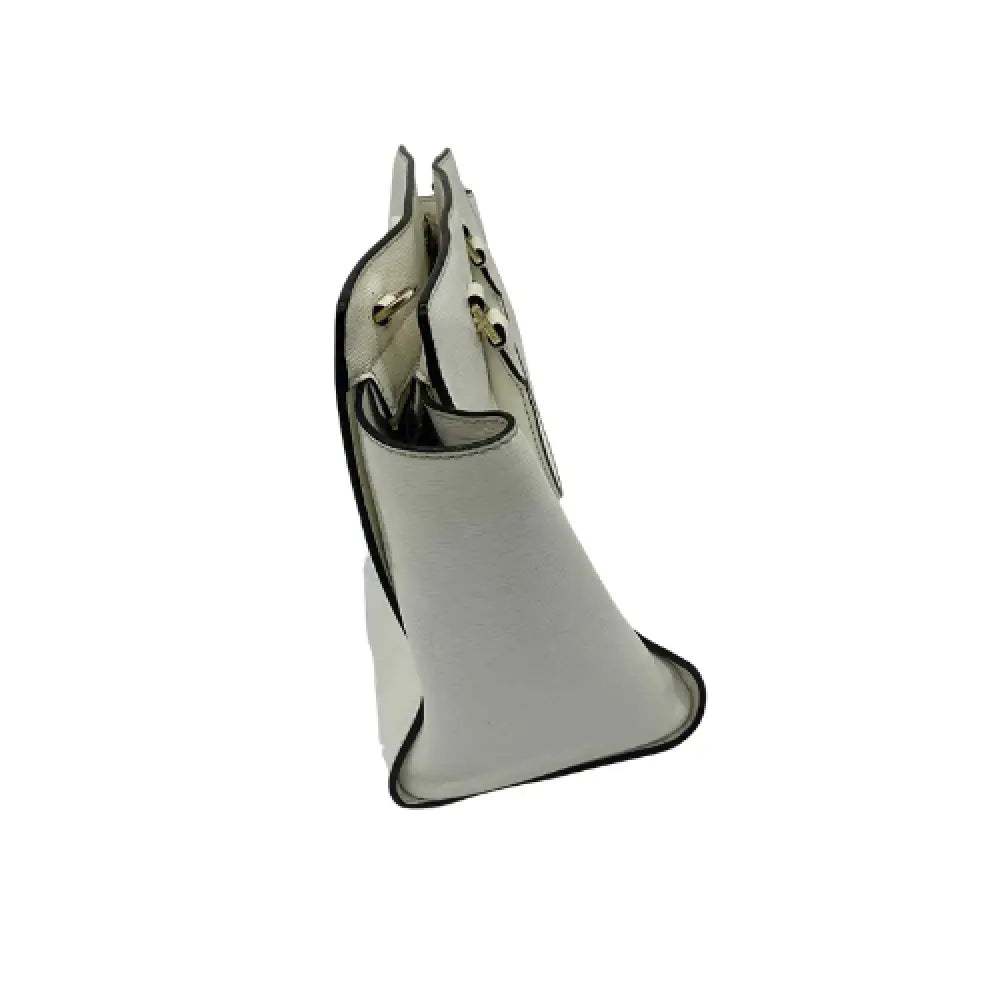 MICHAEL Michael Kors Dark dune saffiano leather satchel bag Goldtone hardware Rolled top handles, 4.5" drop Removable, adjustable shoulder strap with 17.5" drop Top zip closure Interior, jacquard lining one zip and two open pockets; key clip Metal feet protect bottom 8"H x 13"W x 4"D.