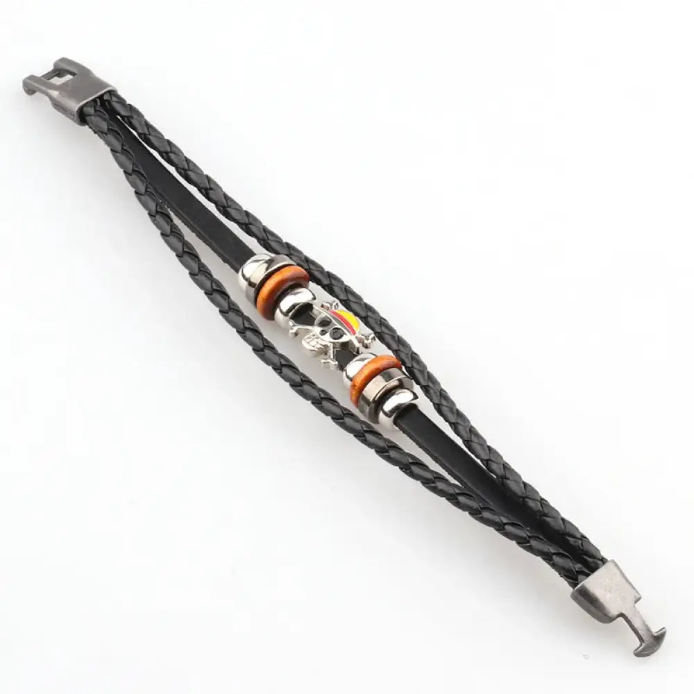 This leather bracelet draws inspiration from the iconic One Piece series, blending understated elegance with subtle nautical flair. Crafted from premium leather, it offers durability and a refined look that complements any outfit. Its design pays homage to adventurous spirit and timeless storytelling, making it a sophisticated accessory for fans who appreciate both style and meaning. Measures 8"