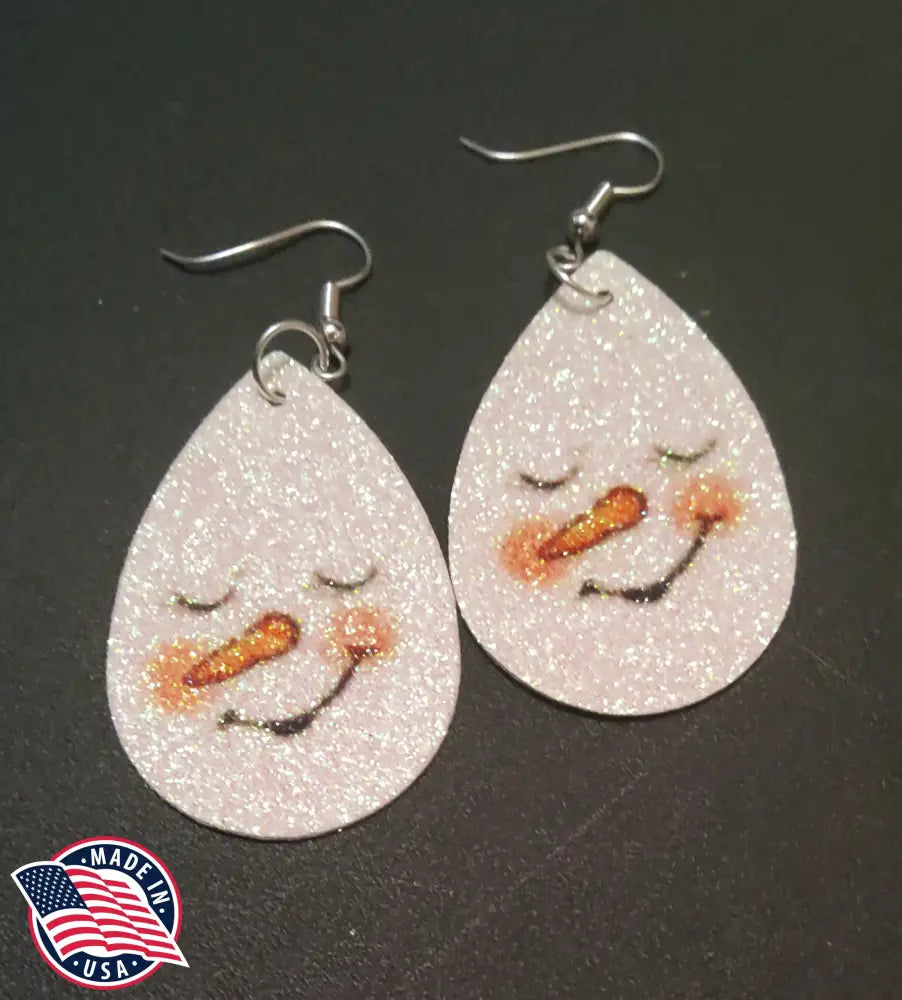 Adorable pair of earrings with a cute snowman face. Teardrop measures 1 1/4" wide x 1 3/4" long. Made with soft leather.