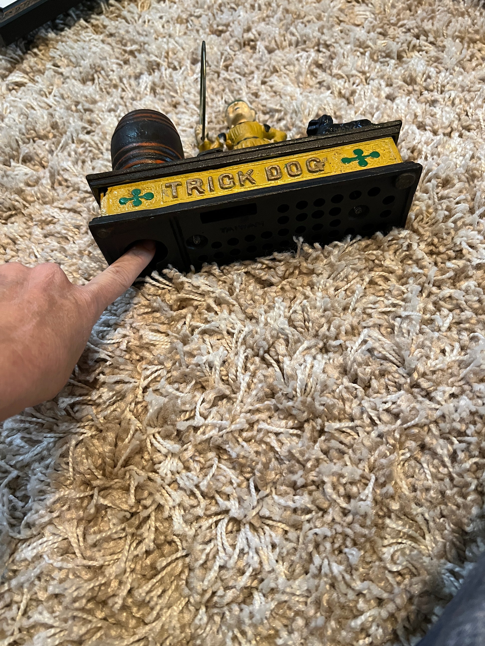 This vintage "Trick Dog" mechanical coin bank is a unique and charming addition to any collection. Made of cast iron, it features a playful dog performing a trick to collect your coins. With its intricate design and smooth functionality, it offers both decorative and functional value. A must-have for any antique lover or coin enthusiast.